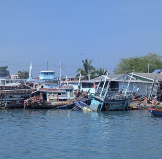 Alle Wege Thailands führen über Bangkok. Dort steigt man in den Bus, Zug oder ins Flugzeug, um die anderen Regionen zu erreichen. So haben wir uns Bustickets für die Reise nach Ban Phe, einer Kleinstadt bei Rayong, gebucht und sind in 4 Stunden recht bequem die 180km gefahren. Allein die Fahrt aus Bangkok heraus hat dabei die ersten 1 ½ Stunden beansprucht. Nach der umtriebigen Hektik Bangkoks wirkte es so, als würde das Leben in Ban Phe in Zeitlupe laufen. Ein warmer Nachmittag am Pier, einige Thais sitzen auf ihrem Posten und genehmigen sich ihre Nudeln mit Meeresfrüchten. Kaputte, teils gesunkene Schiffe liegen neben dem Pier und hungrige kleine Fische werden mit den Abfällen gefüttert, um eines späteren Tages selbst auf dem Teller der Fischer zu landen. Wir setzen uns auf eine Bank und ich lade mir mangels an sichtbaren Taxis die in Thailand verbreitete App „Grab“ als Alternative zu „Uber“. Die App berechnet den derzeitigen Kurs für die angestrebte Fahrt. Leider lässt sich der Wert nicht anpassen, da die angezeigten ~ 130 Baht für keinen der Fahrer in Frage kam. Ich konnte nur auf die Suche nach einer Fahrt in einem „Luxusgefährt“ für knapp 300 Baht umstellen. Dort ließ sich eine Person finden. Dieser Herr wollte wissen, wie viele Personen wir wären (obwohl ich bereits 3 in der App angab). Nachdem ich dazu schrieb, dass wir auch Gepäck hätten, dieses aber bereits in einen 5-Sitzer mit kleinem Kofferraum gepasst habe, hat auch er die Fahrt kommentarlos storniert.